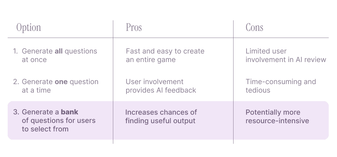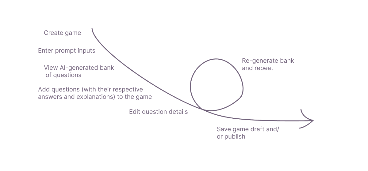 RightOn has never worked with AI before, so I started by diving into research on how to design for generative AI experiences. Building upon the existing game creation flow, I ideated multiple user flows that integrated AI. I debated three question generation options with my team, ultimately landing on the flow that provided the most value to users while balancing human intervention.