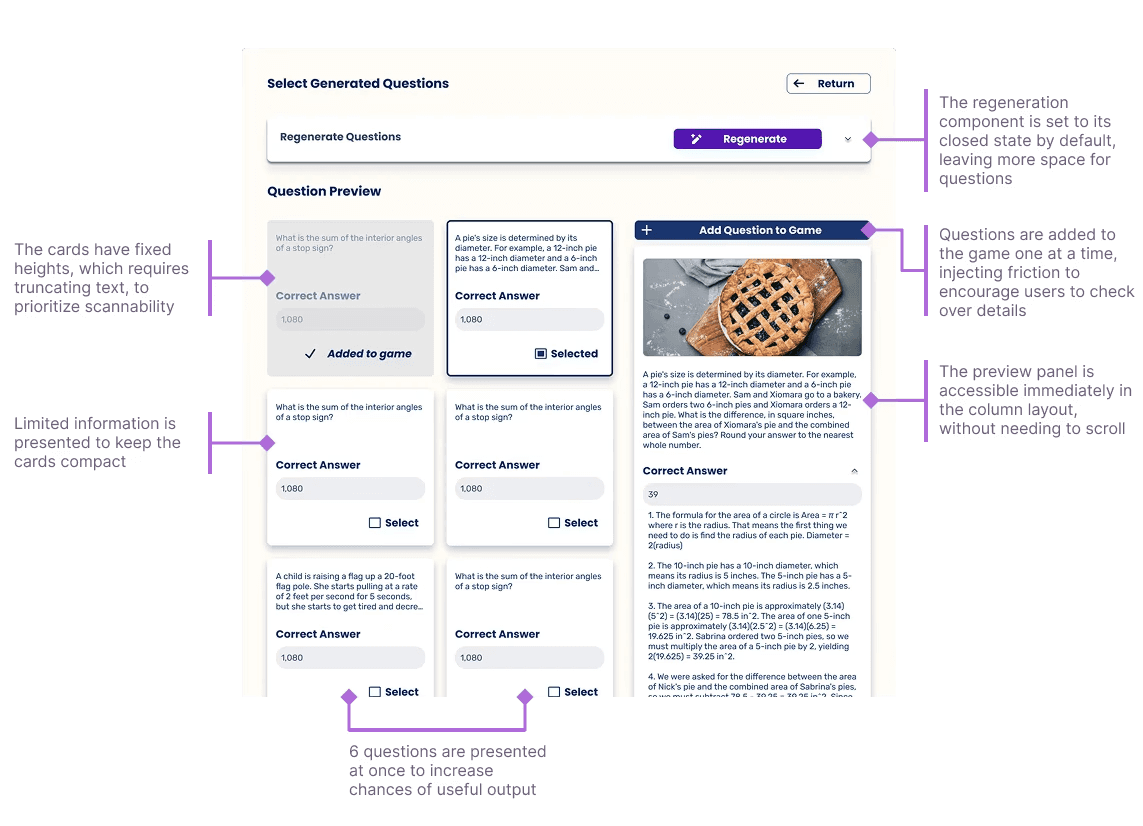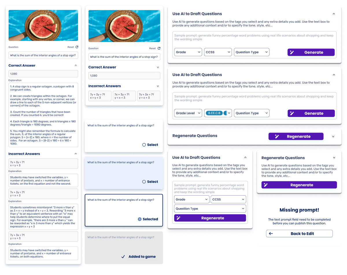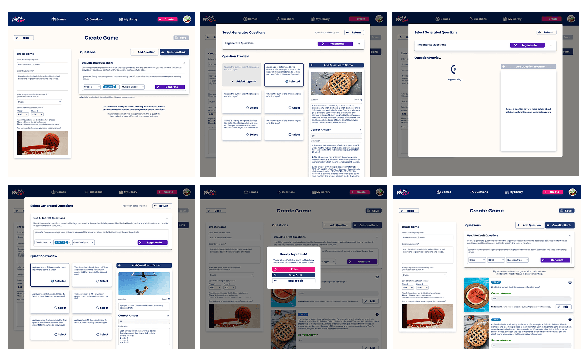 I designed and validated the end to end AI game creation workflow that is now being built for classroom pilots. In the process, I created 3 new key components, 13 component states, and 20+ screens.