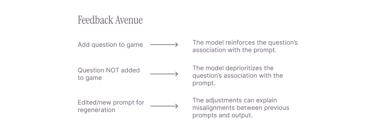 The prompting component scaffolds users through key context inputs so the generated game aligns with their intent.