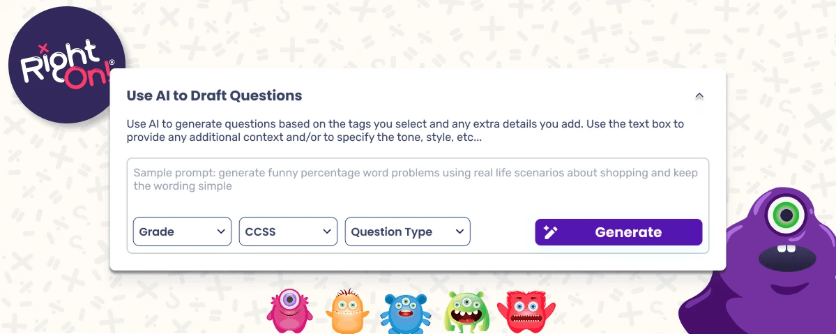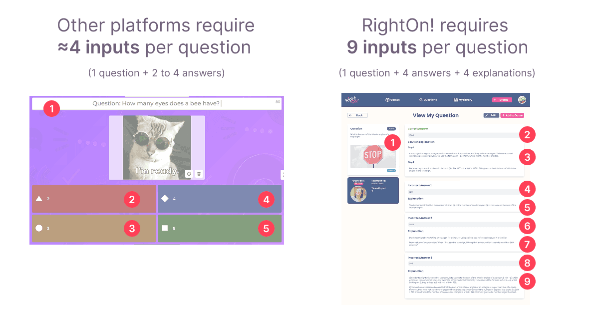Unlike most other quiz platforms that require just questions and answers, RightOn! has designed a specific experience based on pedagogical research that requires users to develop questions, solution steps, distractors, and explanations in order to create a game.